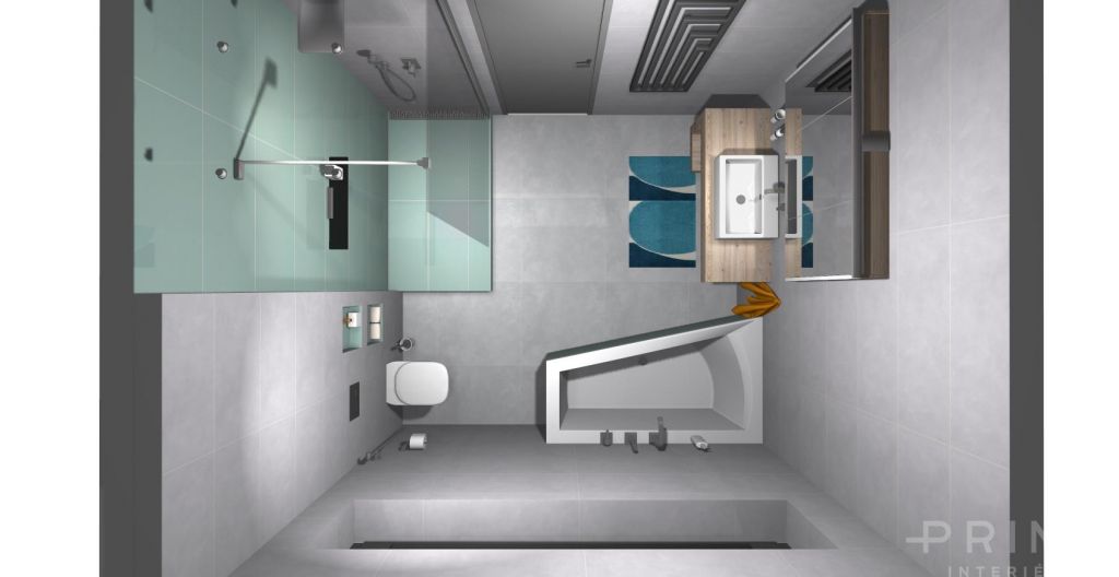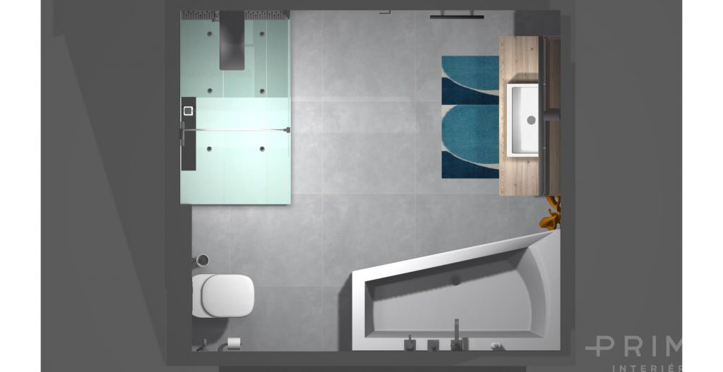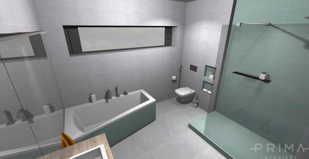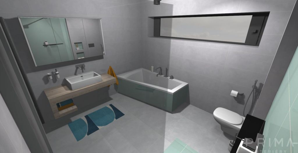 3D vizualizace koupelny / obklad a dlažba ve světle šedé s kombinací mentolové barvy