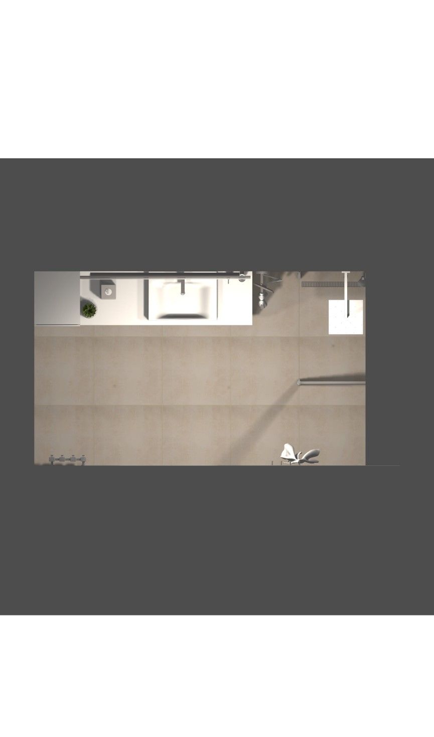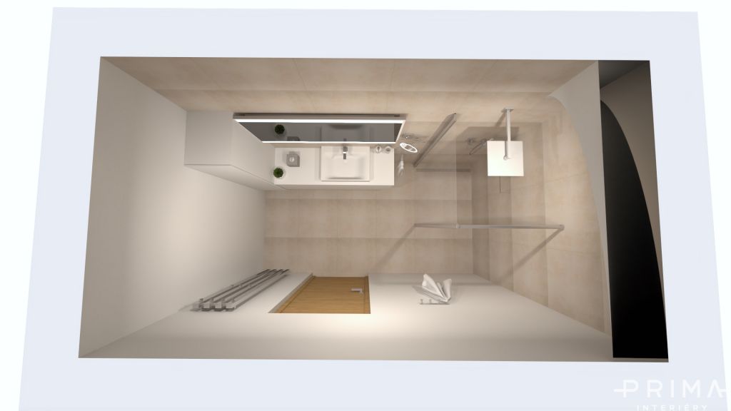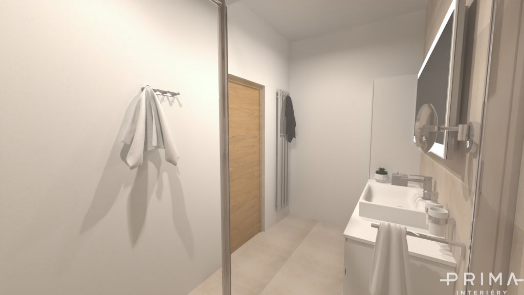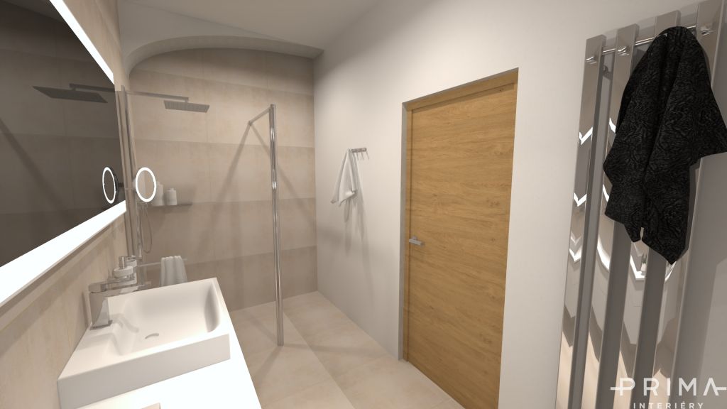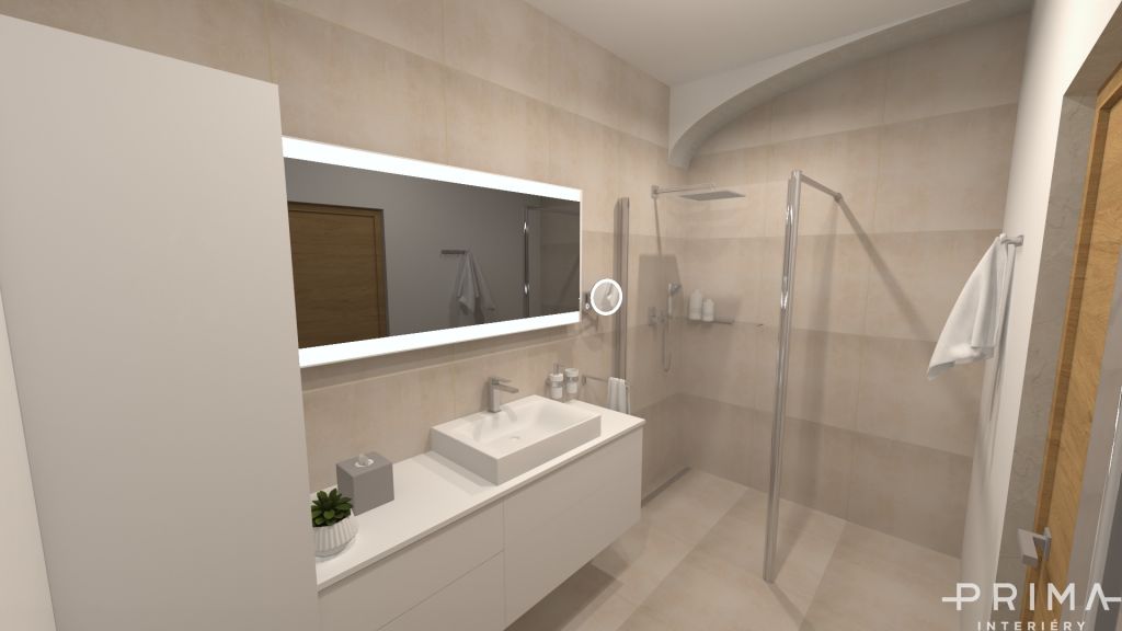 U návrhu této koupelny se klientka rozmýšlela jestli na zdi aplikovat stěrku nebo keramický obklad.